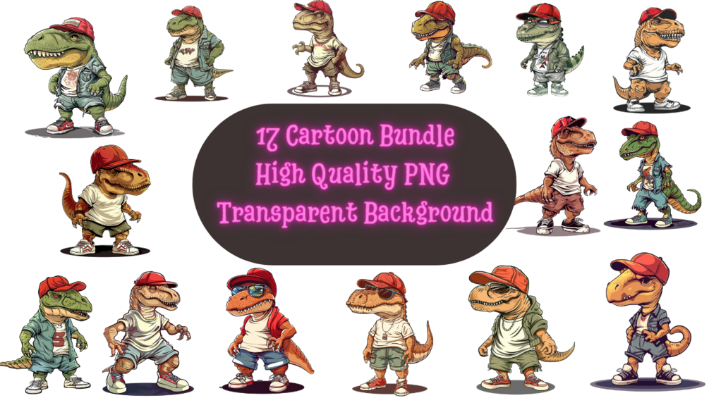Calling all T-shirt designers and dino-enthusiasts! This radical bundle is stomping in with 17 killer PNG images of cartoon T-Rexes rocking the freshest streetwear.