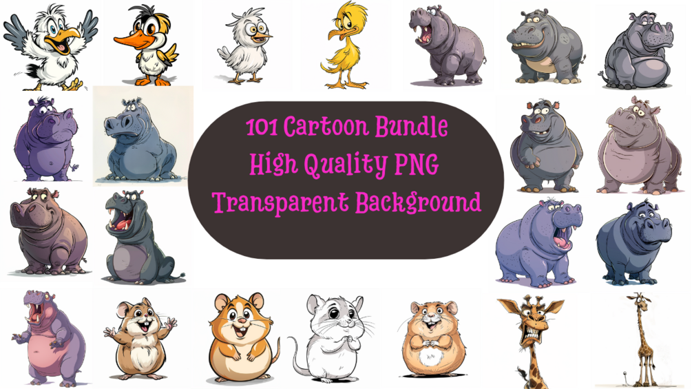 Discover a treasure trove of laughter and charm with our amazing bundle featuring 101 high-quality PNG images with transparent background of amusing and quirky cartoon animals and birds! From hippos to giraffes, from zebras to flamingos, and even wolves, foxes, and pigs – this bundle has it all!